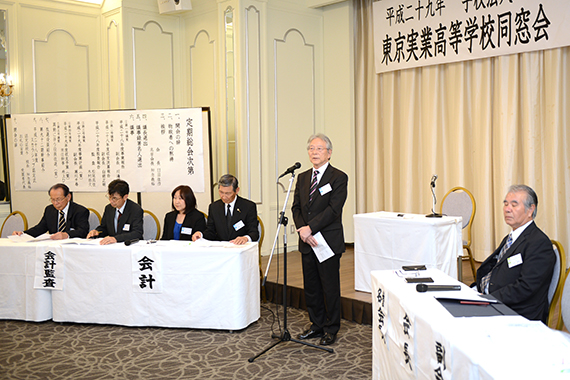 臼田佳彦会長、知念義裕名誉会長(校長)の挨拶の後、会長が議長となり、平成28年度事業報告及び収支決算報告並びに監査報告、平成29年度事業計画及び収支予算(案)、異動に伴う役員改選(案)の5つの議案が議場に諮られ、いずれも全会一致で承認可決されました。