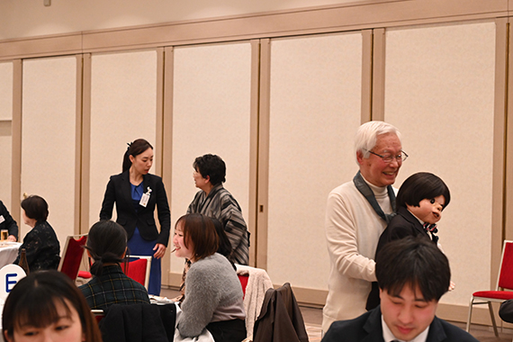 普段は、あまり話す機会がない先生方や先輩後輩の垣根を越えて和気藹々の懇談が続く中、地域の福祉施設やイベントなどで個人ボランティアとして活動されている第38期生の長坂訓弘さんによる「ヒロくんと歌おう・話そう腹話術」の素晴らしい好演を楽しむうちに閉会の時間を迎え、最後に全員で校歌を斉唱し、井上ひとみ副会長の閉会の言葉で盛況のうちに終了しました。(事業部)
